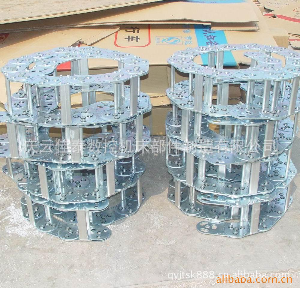 TL系列拖链的主体是由链板(优质钢板镀铬)支撑板(挤拉铝合金)轴销(合金钢)等部件组成,使用电缆或橡胶管与拖链之间不产生相对运动,不产生扭曲变形,链板经镀铬处理外形效果新颖,结构合理,灵巧强度高,钢性高不变形,安装方便,使用可靠,易拆装,尤其是本产品采用了高强度耐磨材料,合金铜为轴销,高了产品的耐磨强度,弯曲更灵活,阻力更小,降低了噪音,从而可保证长时间使用不变形,不下垂。