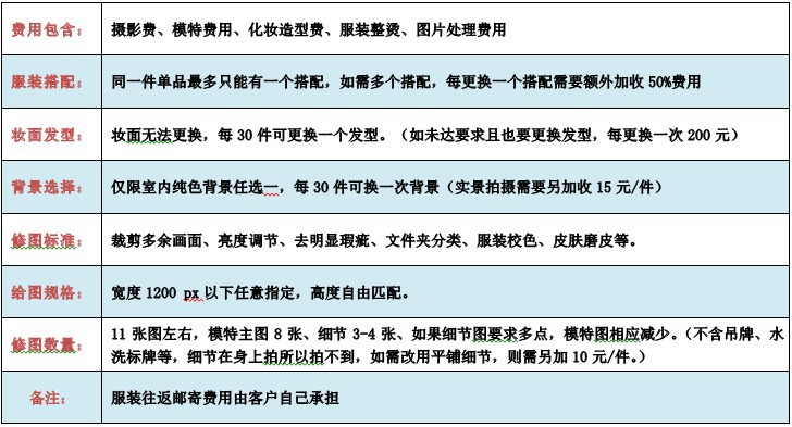 按件收费最低30件起拍,也就是说只有满30件才会安排模特来拍摄一次,低于这个数量的也要出30件的费用的。不接受拼单。之前我们也拼单,但是服务客户过多,难免会影响产品品质,因此公司决定不再接受拼单,还请谅解。