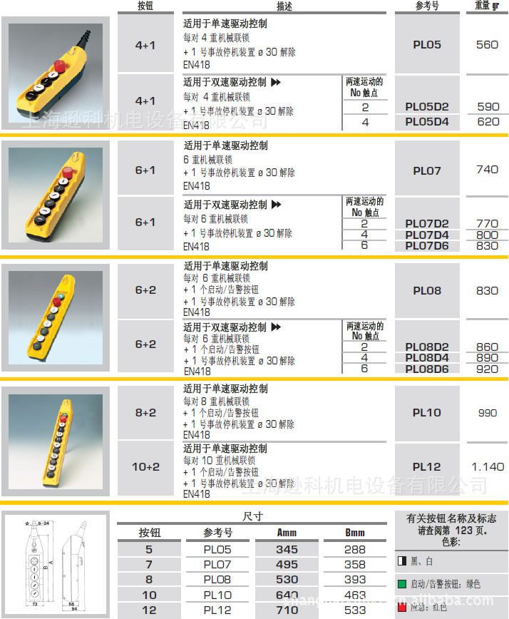 每个按钮有单速、双速之分,其中双速按钮为G.G的特色产品,特别适用于一些用到变频调速的起重机。