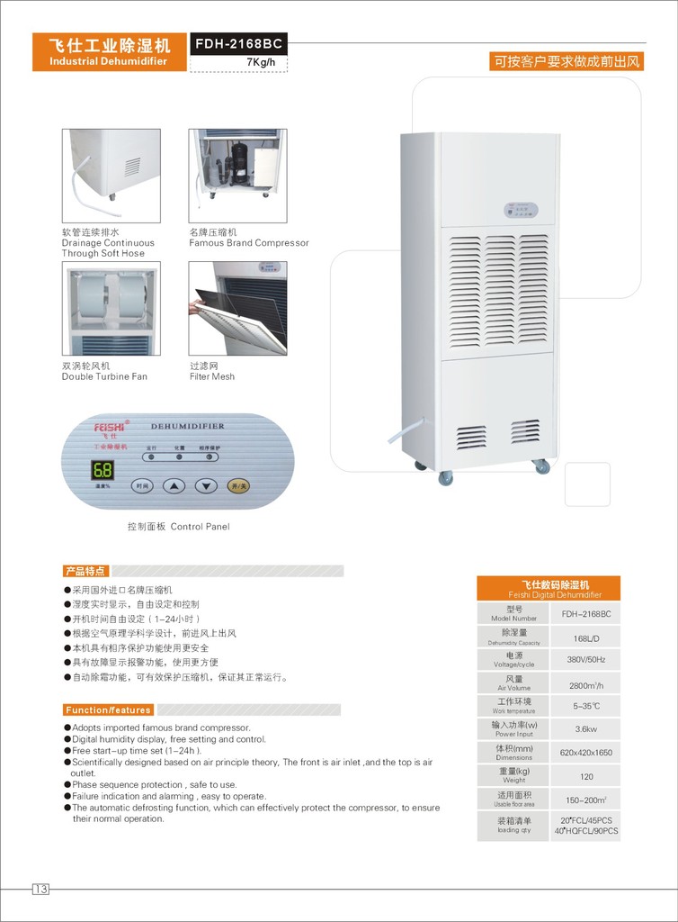 目前,我公司除湿机、加湿机已有三十几种规格供用户选择,生产的品种齐全,有家用除湿机,商用除湿机,工业除湿机,管道型除湿机,冷冻型除湿机,调温型除湿机,水冷型除湿机,防爆除湿机,恒温恒湿机,及各种加湿机等等。已广泛使用在,电力,仓储,人防工程,纺织、印刷、卷烟、医药、国防、花卉养殖大棚、菌类栽培、微电子企业、档案室、电信、木业纸业与行业车间、仓库,直接进行湿度调节,空气净化。为用户提供了满意的环境要求。