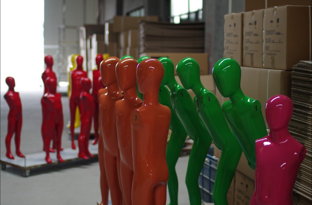 本公司生产的产品主要由玻璃纤维丝布及不饱和树脂191加工而成,具有重量轻、强度高、不易碎、不变形等众多优点。产品款式新、品种全,大约有50系列上百余个款式。其中包括成年男女模特系列、运动系列、儿童系列、抽象系列等。男女模特分有发型、光头、平颈、站姿、坐姿、布台、人台、裤台等。