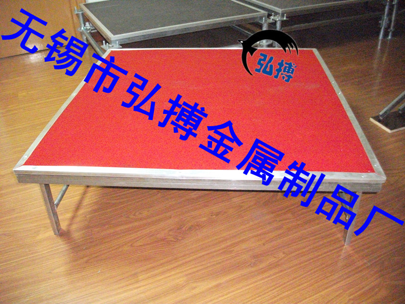 舞台高度常规为:30-40之间,也可以根据要求定做调节高度。舞台表面铺有红色5M毫米地毯,包边采用钢铁型材,美观大方。日前此款舞台受到全国各地婚庆行业的热捧,鉴于规格小,折叠快速,方便灵活。稳定性非常稳固等特点,性价格极高,价格按块(张)计算。比常规大型拼装舞台价格上大大降低了成本,运输方便,搭建速度,折叠舞台原理非常简单,立柱中间有折叠腿为弹性伸缩管,打开伸缩管装上销子既可使用,整个结构完美大方,质量上乘,完成演出后折叠腿部仅需要取下销子腿部自然对折入内,具体参数请详询公司销售!欢迎您的选购!目前公司更多新的产品正在更新中,请继续关注我们公司官方网站和诚信阿里巴巴和淘宝网。我们竭诚为您做到更好!
