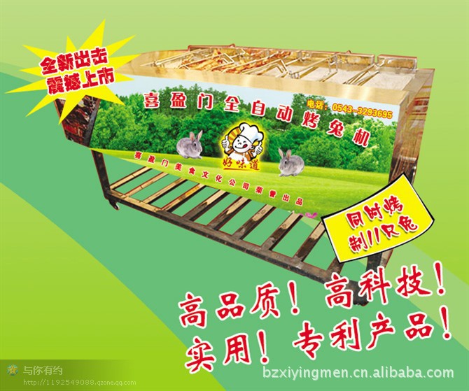 现专业生成烧烤店用大型烤兔机(同时可烤羊排、鱼等)无烟木炭不锈钢烧烤桌(高、中、低)三种类型供客户选用。也可单独购无烟烤炉。同时有燃气无烟烤炉供应用户。也有用于小本创业或流动经营的多功能小吃车,炒货机、豆芽机等供用户选择。本公司视质量为生命,以诚信立足社会,靠品质和服务创立品牌,热诚期待与有识之士及合作伙伴携手共创辉煌。