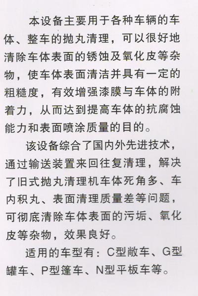 本 公司是生产抛丸清理设备的专业企业。主要生产:SLQ31、Q32、Q35、Q36、Q37、Q38、Q69等系列抛丸清理设备及大型通过式预 处理设备;水泥机械系列产品:S112、S114、S116混砂机及各种型号的混砂配件;同时配套生产特种合金耐磨铸铁、铸钢件。本公司向客户提供整机整 线的成套设备包括标准的或客户特殊要求的设备。