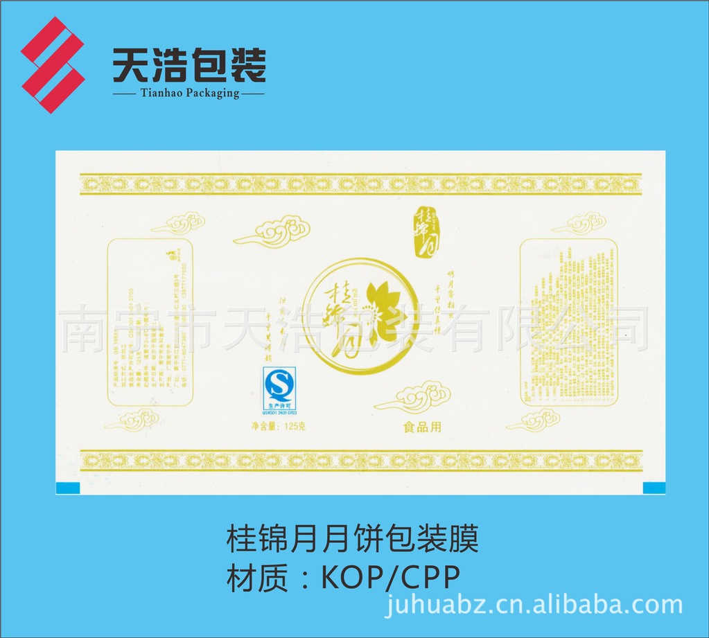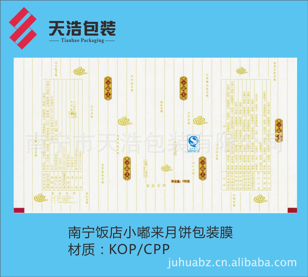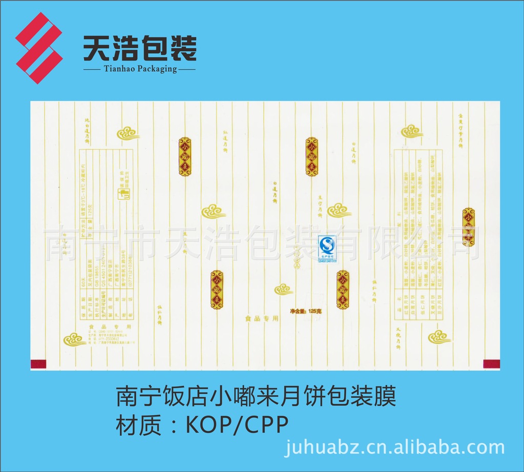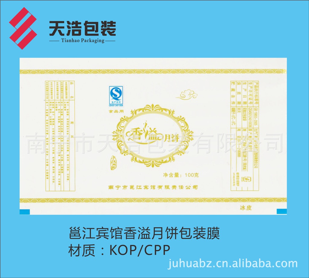 月饼是中国传统佳节——中秋亲朋好友之间馈赠佳品,月圆人聚之美好时刻,如果出现溢味霉变,将是扫兴之事。为了有效延长月饼的保质货架期,厂家采用高阻隔材料K膜/CPP结构复合膜袋包装。本公司专业生产彩印复合包装膜,在广西彩印包装行业率先通过QS市场准入认证。为满足广大月饼厂家需求,现推出KOP21/CPP40-50复合膜卷材。一般工艺先涂布后印刷(BOPP/PVDC/印刷/CPP),采用醇溶粘合剂干法复合,最大限度地降低溶剂残留,有效阻挡印刷油墨中溶剂向包装袋内的渗透,确保月饼的卫生安全,且供货及时,确保月饼销售后期急需之用。