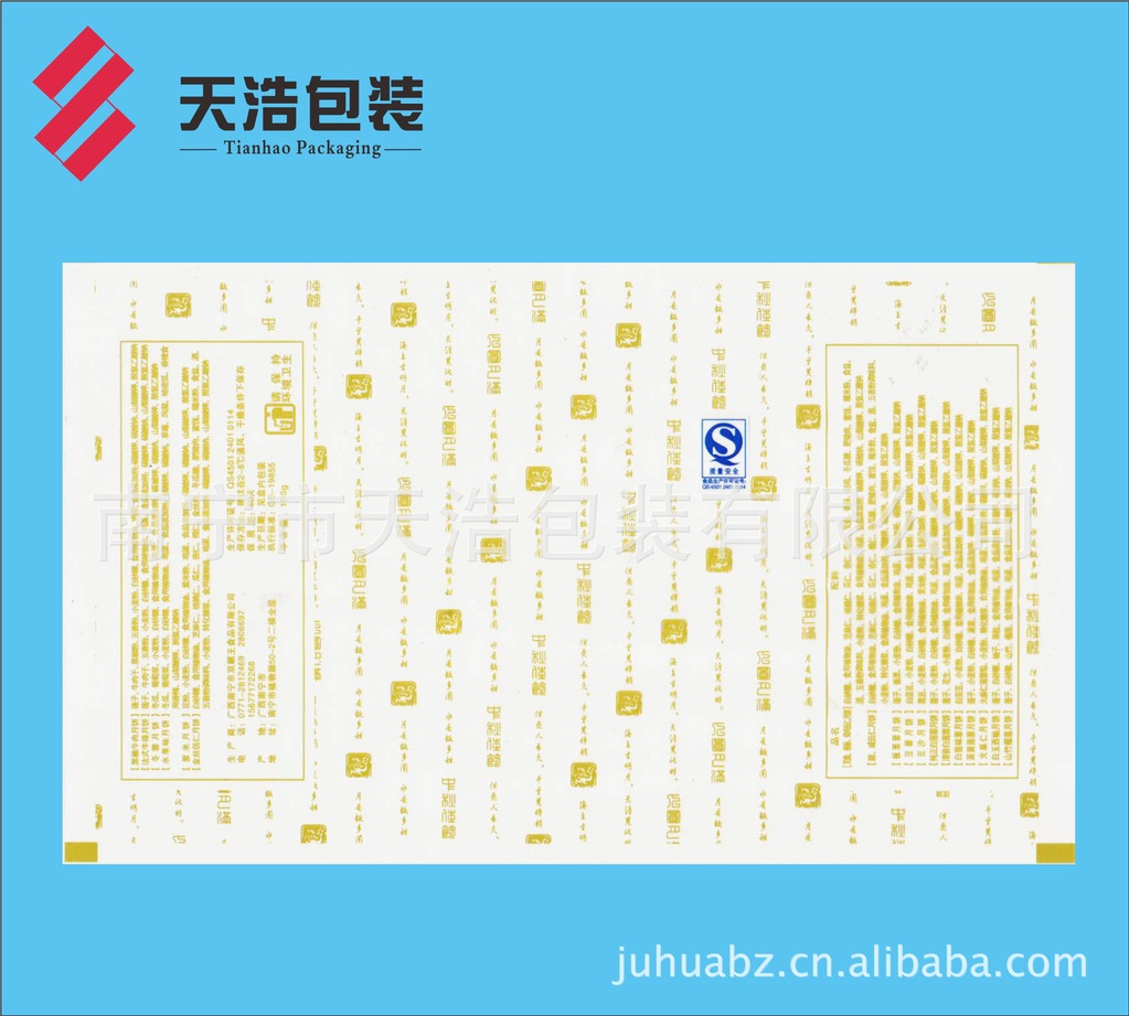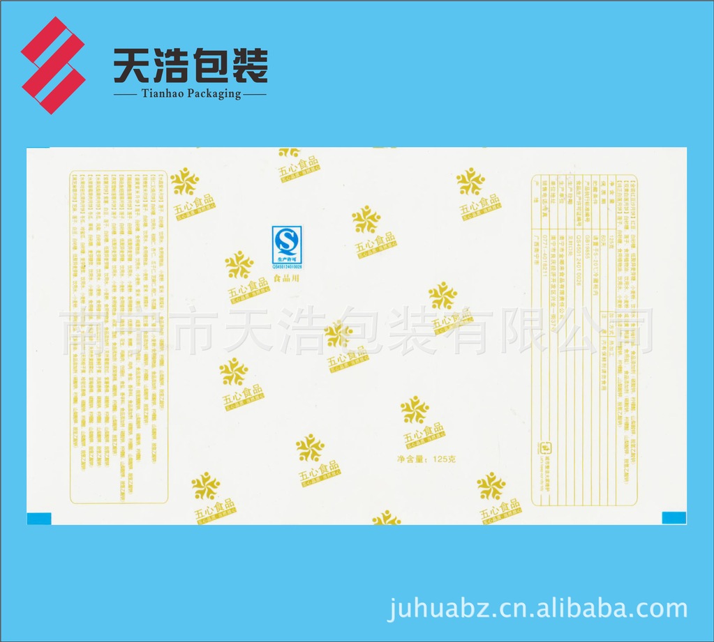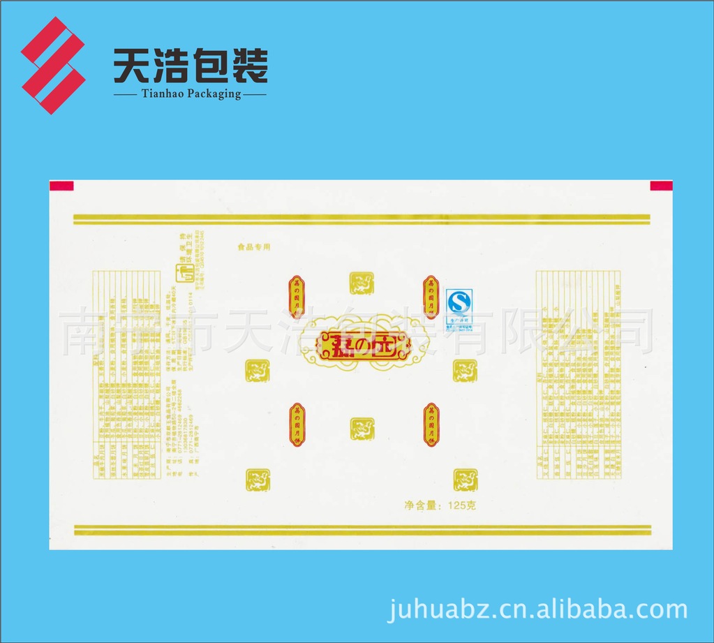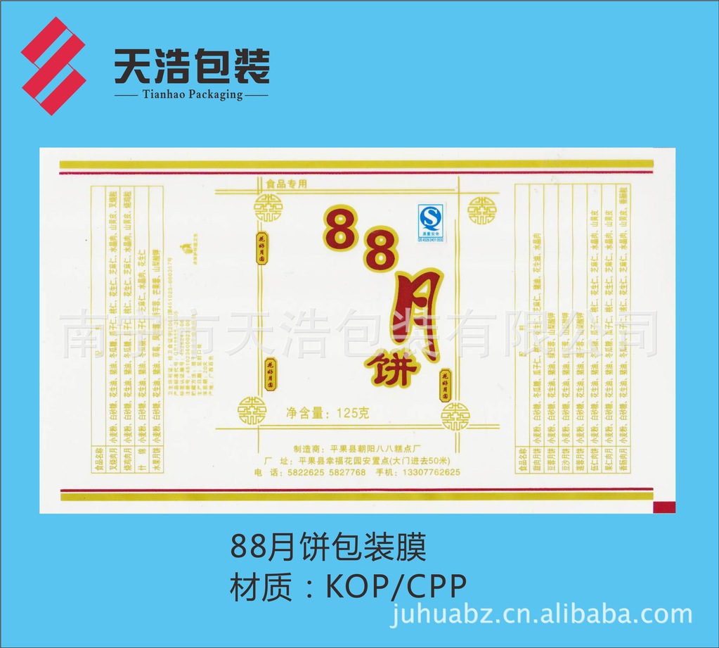 月饼是中国传统佳节——中秋亲朋好友之间馈赠佳品,月圆人聚之美好时刻,如果出现溢味霉变,将是扫兴之事。为了有效延长月饼的保质货架期,厂家采用高阻隔材料K膜/CPP结构复合膜袋包装。本公司专业生产彩印复合包装膜,在广西彩印包装行业率先通过QS市场准入认证。为满足广大月饼厂家需求,现推出KOP21/CPP40-50复合膜卷材。一般工艺先涂布后印刷(BOPP/PVDC/印刷/CPP),采用醇溶粘合剂干法复合,最大限度地降低溶剂残留,有效阻挡印刷油墨中溶剂向包装袋内的渗透,确保月饼的卫生安全,且供货及时,确保月饼销售后期急需之用。