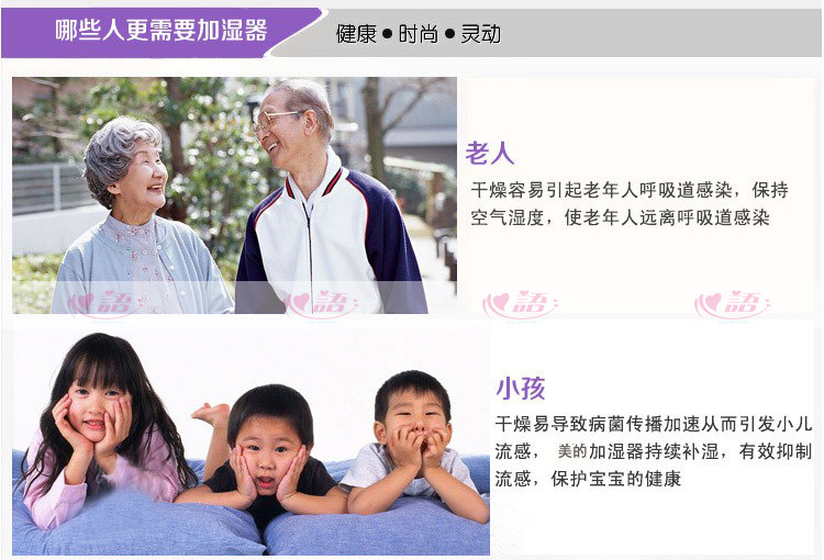 干燥会加速体内水分流失,肌纤失去韧性而导致断裂,会形成无发恢复的皱纹,美凌加湿器保持室内的湿度,使肌肤处于健康润泽的环境.