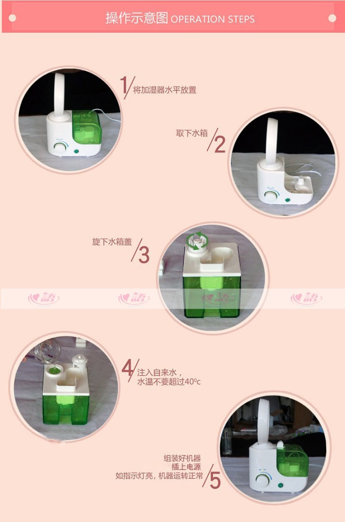 在水中添加植物精油或药液等,随水雾散发,满室生香,使身体更易吸收,有治病养神,保健理疗效果,尤其对于皮肤过敏、失眠、感冒、咳嗽、哮喘具有极佳的辅助效果,是传统香薰产品的最佳换代选择。