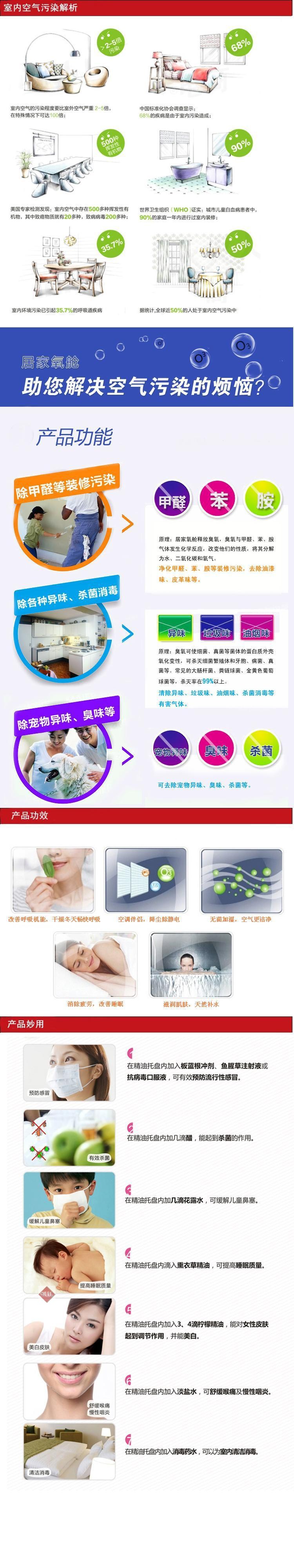 随着人们生活水平提高,空调广泛使用,导致皮肤紧绷、口舌干燥、咳嗽感冒等空调病的滋生。本产品在雾化过程中,释放大量负氧离子,能有效增加室内湿度,滋润干燥空气,并与空气中漂浮的烟雾、粉尘结合使其沉淀,能有效除去油漆味、霉味、烟味及臭味,使空气更加清新,保障您和家人的健康。