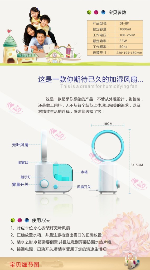 非常适合家庭和办公室加湿空气,雾气量随意调节,增加风扇功能,多功能一体机