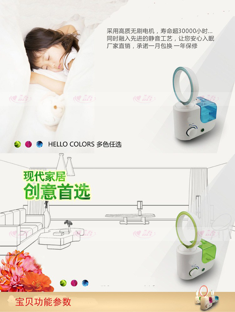 | 中山英尚电器有限公司是集研发、生产、营销为一体的全资公司,产品领域主要包括小家电、煮蛋器、干衣机、电热水壶、加湿器等日用电器产品,其宗旨是按照公司战略规划,生产经营高品质、高端产品,满足消费者的需求,用最具竞争力的产品、最优的质量、最好的服务,力争在最短时间内跨入行业前列。 2012年公司将投入大量资金,在中山筹建集研发、生产于一体的综合复合型生产基地 ,拥有完整、科学的质量管理体系。中山市英尚电器有限公司的诚信、实力和产品质量获得业界的认可。欢迎各界朋友莅临参观、指导和业务洽谈。 2012年公司专业开发了:咪咪熊、心语、两款网络专供品牌,欢迎各网络卖家前来批发订货!公司承接各种小电器商务礼品制作、贴牌加工、外贸单加工、商务团购、商城卖家供货等各类定制单,欢迎登陆公司网站参考,或致电:18208293001 (经理:宁世雄)咨询面议! 选择“心语”牌无叶风扇加湿器的信心保证!品牌保证,质量更放心! 1、 超乎想象的创意设计,艺术与生活的完美结合 2、 均衡加湿器,冷雾循环扇,单独开关控制 3、 采用高质无刷电机,寿命超30000小时 4、 先进的静音工艺,让您安心入眠 5、 独立开关旋扭,雾量随心调 6、 进风口活性炭过滤网,防止细菌进入 7、 HELLO COLORS多色任选 |