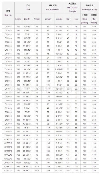 自锁式/尼龙扎带材质:符合UL94 V-2要求的Nylon66,耐酸性、耐腐蚀、绝缘性良好、不易老化、抗拉力强*另备有符合ROHS材质