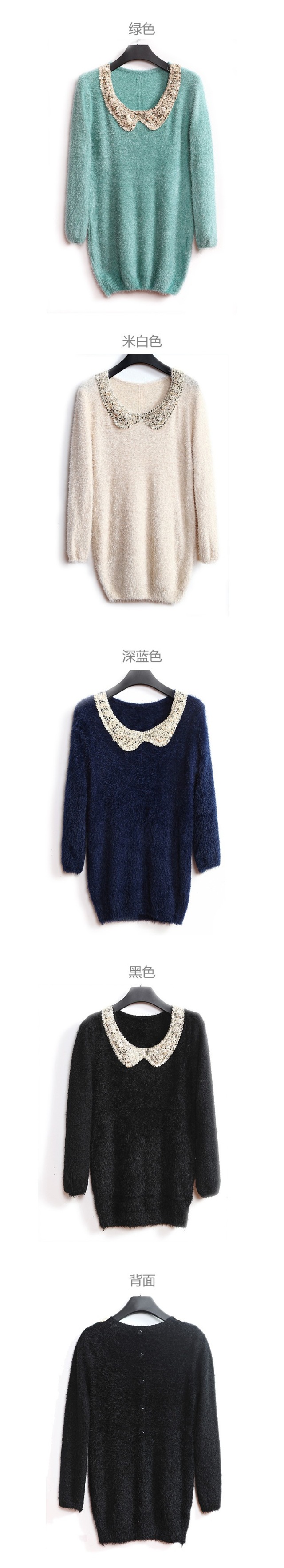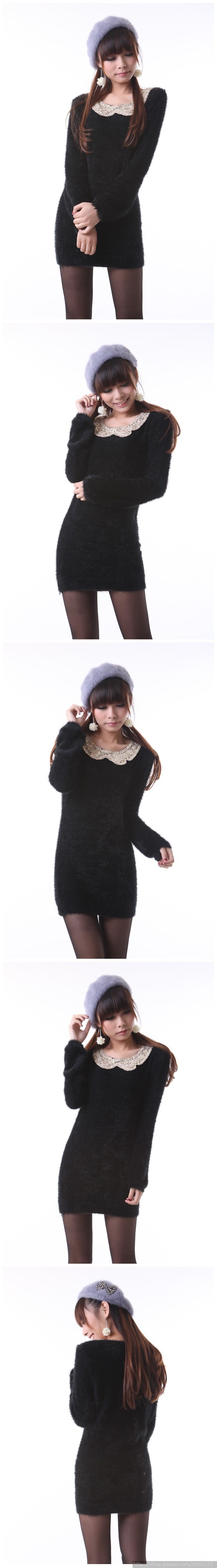2012秋冬中长款长毛绒娃娃领后排扣毛衣修身针织衫亮片串珠打底衫