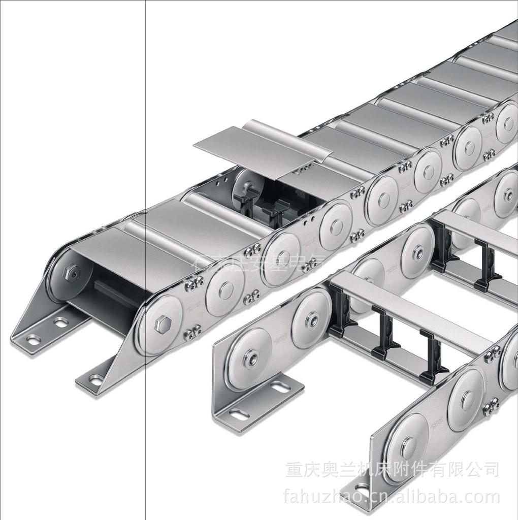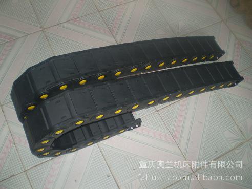 单元链节由左右链板和上下盖板组成,拖链每节都能打开,装拆方便,不必穿线,打开盖板后即可把电缆、油管、气管等放入拖链内。
