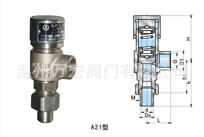 用途A21型适用于工作温度《200℃的空气、氨、石油气 等介质的设备和管路上。型适于工作温度《200℃含腐蚀蚀性的气体或液体的设备和管路上,A21型适于工作温 度《200℃的液化气、石油气等设备和管路上,作为超压保护装置。当设备和管路内压力超过允许值时,阀门自动 开启,继而全量排放;当压力降低到规定值时,阀门自动 关闭,保证设备和管路安全运行。