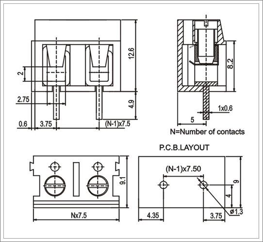 Pitch:7.5mm材质及电镀螺丝:M2.5,钢,镀锌簧片:磷青铜,镀镍或不锈钢焊针:黄铜,镀锡塑件:PBT,UL94V-0电气性能额定电压:300V额定电流:16A接触电阻:20m?绝缘电阻:5000M?/1000V耐电压:AC1500V/1Min使用线径:22-14AWG 2.5mm²机械性能温度范围:-30ºC~+120ºC瞬时温度:+250ºC 5秒扭距:0.5Nm (4.5lb.in)剥线长度:4.5-5mm