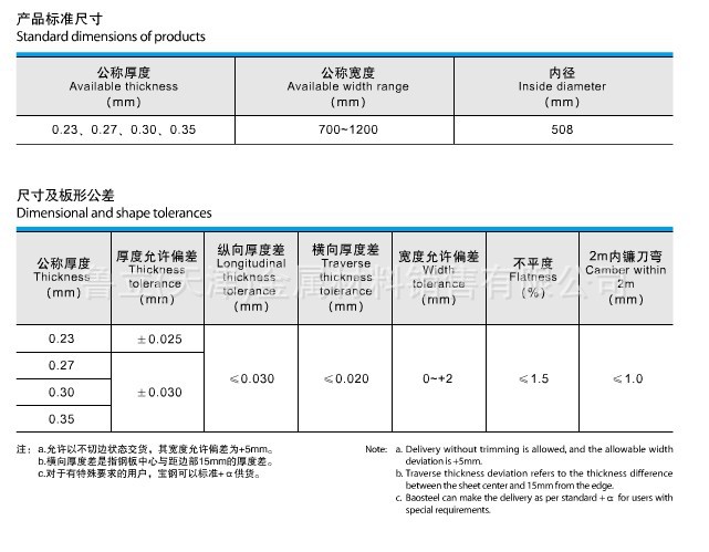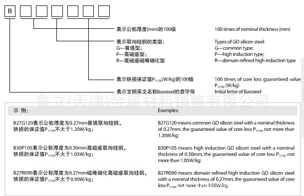 电工钢除上表品种类别外,还有一些特殊用途的电工钢板,如0.15和0.20mm厚3%Si冷轧无取向硅钢薄带和0.025、0.05及0.1mm厚3%Si冷轧取向硅钢薄带,用作中、高频电机和变压器以及脉冲变压器等;继电器和电力开关用的0.7mm厚3%Si高强度冷轧无取向硅钢板;新型高转速电机转子用的高强度冷轧电工钢板;医用核磁共振断层扫描仪等磁屏蔽和高能加速器电磁铁用的低碳电工钢热轧厚板和冷轧板;高频电机和变压器以及磁屏蔽用的4.5%~6.5%Si高硅钢板等。