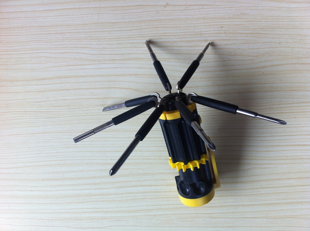 生活创意 非常实用的会亮光的8头螺丝刀,带有8个螺丝刀头,分为十字螺丝刀跟一字螺丝刀两种,螺丝刀的尺寸有些不同,可以用来旋不同的螺丝(修眼镜、拆电脑机箱等等)。最重要的特点是这款螺丝刀装上两节电池之后,多功能螺丝刀还会亮光,因此,也适合夜间及暗处使用