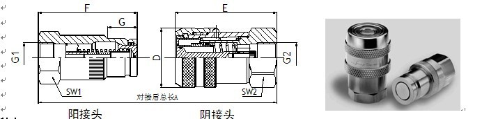 阴接头 型号 | 阳接头 型号 | 通径 | 接口尺寸G1/G2 | 分开时最大 泄漏量cc | E | F | G | A | D | SW1 | SW2 | 工作压力bar | |