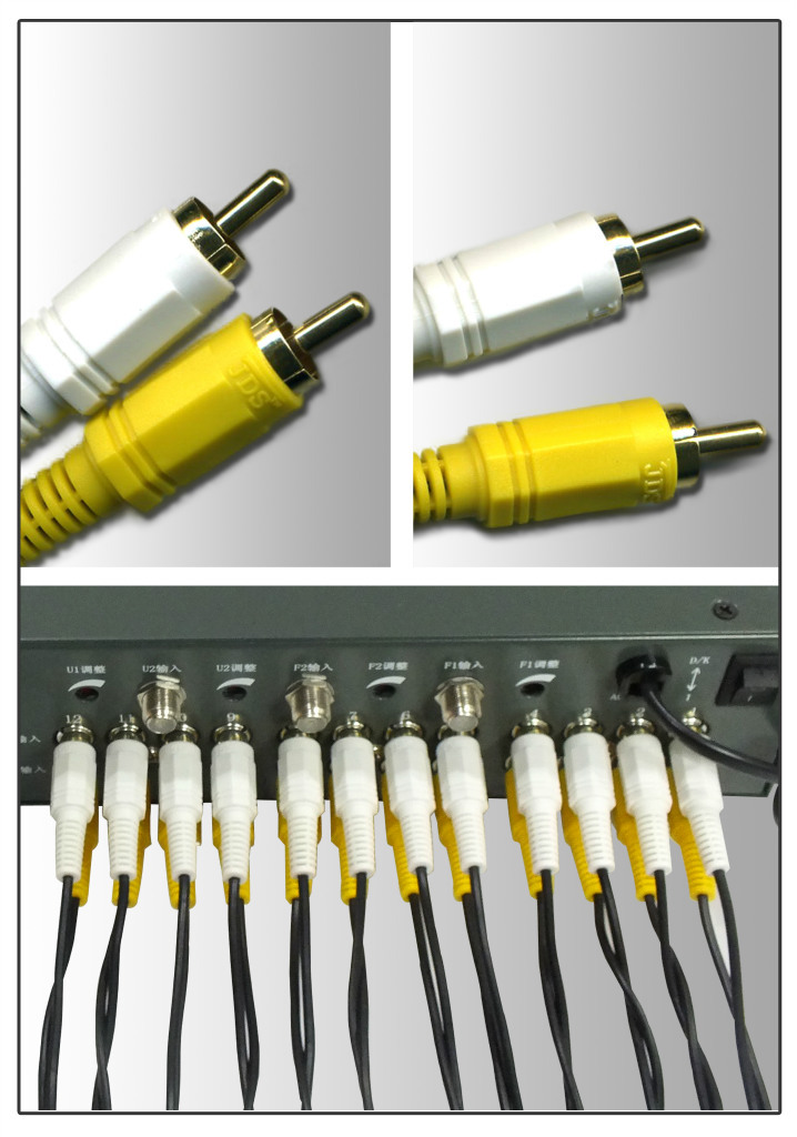 我们在专业市场上多方寻找,也没能找到价廉物美的AV连接线。因此为了配套佳得视设备以及我们的工程,我们在东莞本地委托了一家专业连接线材制造商按照出口欧盟的标准,批量订制了连接线,此款连接线使用优质镀金RCA插件,线芯加粗使用(7X0.12)OFC无氧铜OFC铜芯,屏蔽层为(30 X0.10)OFC无氧铜编织网,使用柔韧度极佳的PVC外皮封装,该线抗干扰能力强,多次插拔均能良好连接,线芯注重内涵,外径合理,适合工程安装及机柜安装孔穿越,节省空间。我们根据有线电视调制器的特点,订制成两芯四头的RCA线,不浪费多余插头,安装更简单,更美观。