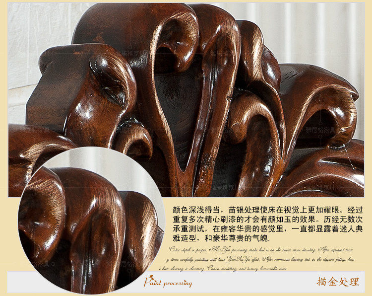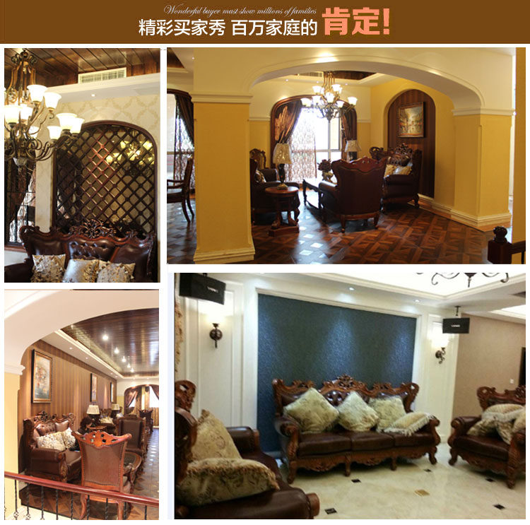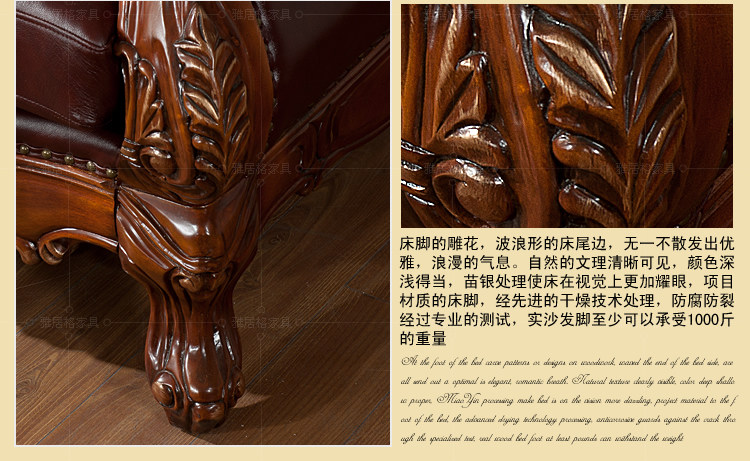 1.材料:框架为泰国进口橡胶木,手工雕刻,其它部分为高密度海绵+接触面真皮+全实木.