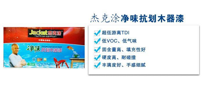 杰克涂木器漆不仅仅具有环保性,而且同时具备高固含、丰满度佳,对各种素材表面有良好的附着性,漆膜坚韧硬度高,具有高度的耐耗性及耐撞击性,并且涂膜受热不会软化,耐热点极高,鲜度持续性都很优良。是目前水可稀释的最现代化、性能优异的环保型的木器涂料。