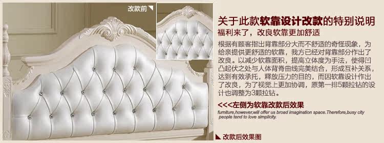 它是华丽的化身,圣洁的代名词,它的出现总是备受瞩目,它的存在总是让人难以忘怀,它是罗曼美式田园的一哥,它以累计销售1045套,月销售235套,8765的人气收藏,4.7的优质评分让自己的地位在全网屹立不倒! 抄底价强势推出! 1.5米大床原价3980元,5折包物流只需1990元,直省1990元! 1.8米大床原价4980元,5折包物流只需2490元,直省2490元! 降价不降质,加料不加价! 真皮软靠+实木床柱+珍珠粉工艺+实木条排骨架,每一点都真材实料,每一点都成本高昂,我们的价格、成本都是摆在眼前,公公道道,有价有市的,只要您了解市场,只要您去实体店看一看,您就会发现比实体店更便宜更优惠!