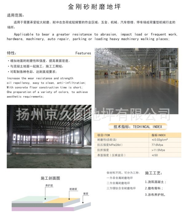地面加硬耐磨料是一种即时可用的特殊骨料制成的加硬耐磨材料。一为非金属矿物骨料型;二为金属砂特殊矿骨料型;三为特殊合金骨料型。特点:极高耐磨性,永久抗蚀性,耐冲击,减少灰尘,施工方便。28天后硬度:特殊矿物骨料型:大于60Mpa,特殊合金骨料型:大于65Mpa.
