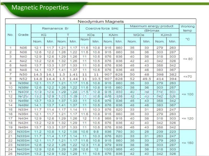 钕铁硼磁性材料,作为稀土永磁材料发展的最新结果,由于其优异的磁性能而被称为“磁王”。钕铁硼磁性材料是钕,氧化铁等的合金。又称磁钢。钕铁硼磁性材料牌号有:N30~N52;30H~50H;30SH~50SH;28UH~45UH;30EH~38EH;30-35AH等。是目前常用的高磁性磁铁。