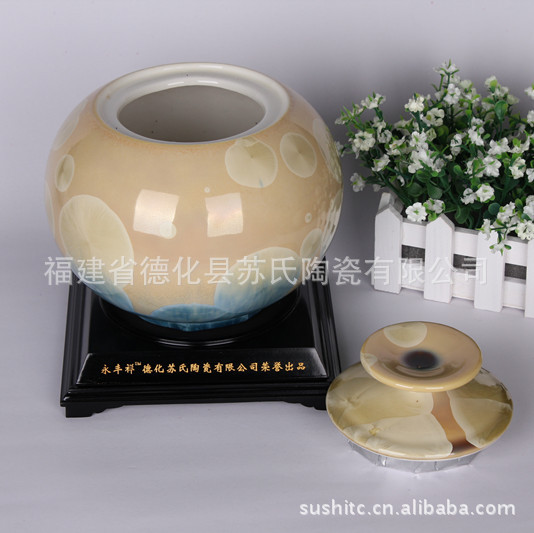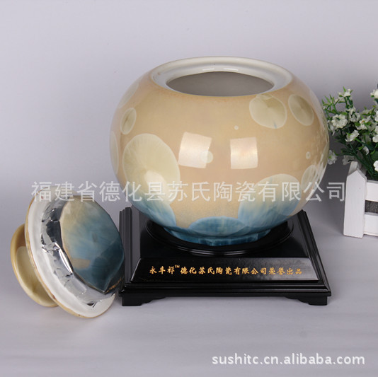德化结晶釉瓷特点:造型美观,典雅大气,雍容华贵,尽显吉祥富贵的皇家气派。为馈赠、收藏与玩赏之佳品,有之“千窑一宝” 、“十窑九不成”之说。具有很高的欣赏价值和收藏价值。