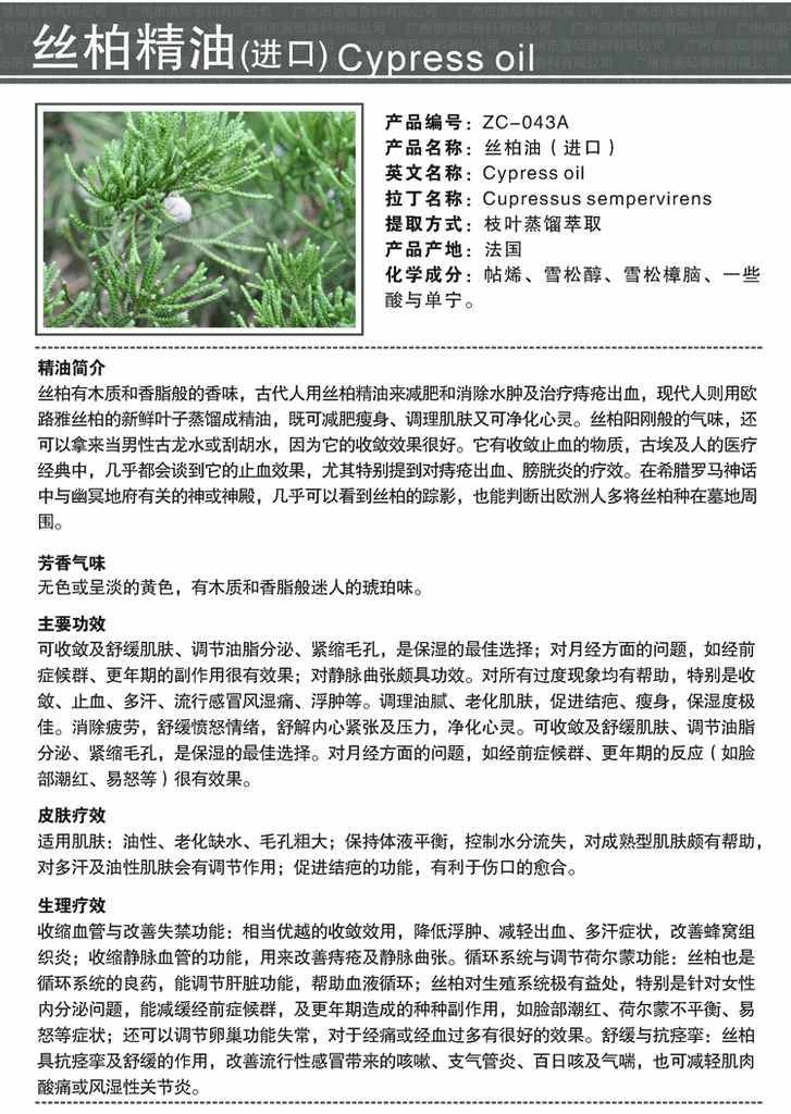 6.强化呼吸/改善体力:丝柏精油3滴在香薰炉中作蒸薰或将丝柏精油5滴加在一浴缸中,作薰泡浴,可消除疲劳,强化身体机能,使精神充沛.
