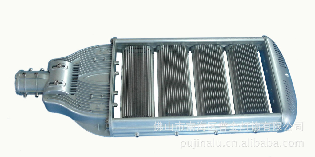 该LED路灯外壳采用电源和光源分离散热结构,第一、光源部分,灯壳散热主体散热面积可0.34㎡/组;灯壳与光源接触部分的厚度为5mm,便于热量迅速传导到灯壳,然后向灯体外散热片传导;灯壳与灯壳之间和空隙,便于空气上下对流。第二、电源部分,放置在上下有通风孔的电源盒里,同时灯壳的外表面也有许多散热片,增大了散热面积,便于空气的对流和热量的辐射。