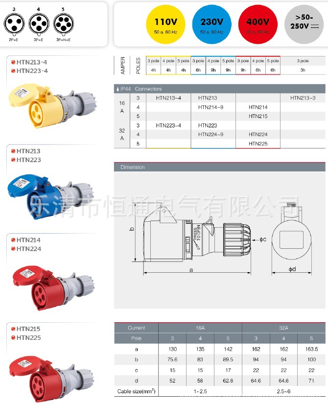 5)恒通HTN系列工业插头插座产品,使用的均为高等级工程级塑料原料(包括PA6、PA66及PC),环保铜,抗锈抗腐蚀螺丝