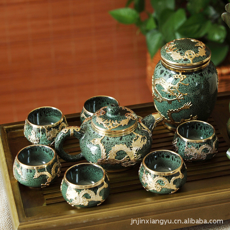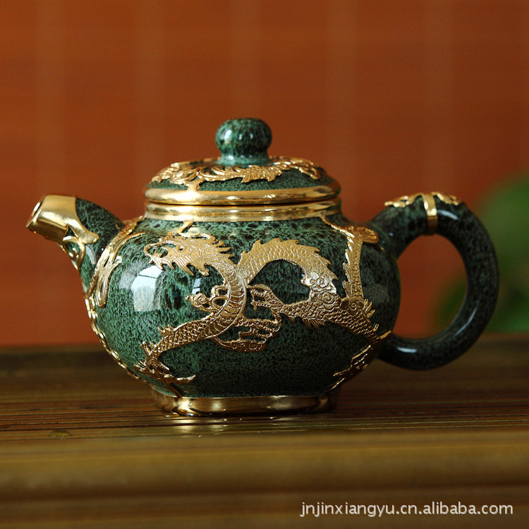 技术:“金镶玉”系列产品均为纯手工制作,经过工人师傅的干压、镂雕、镶嵌等将图案镶嵌在茶具表面,使其产品华贵高雅,古色古香。