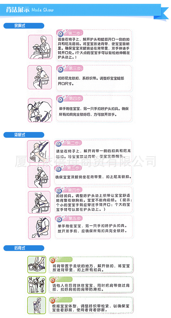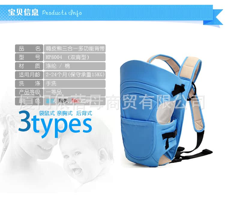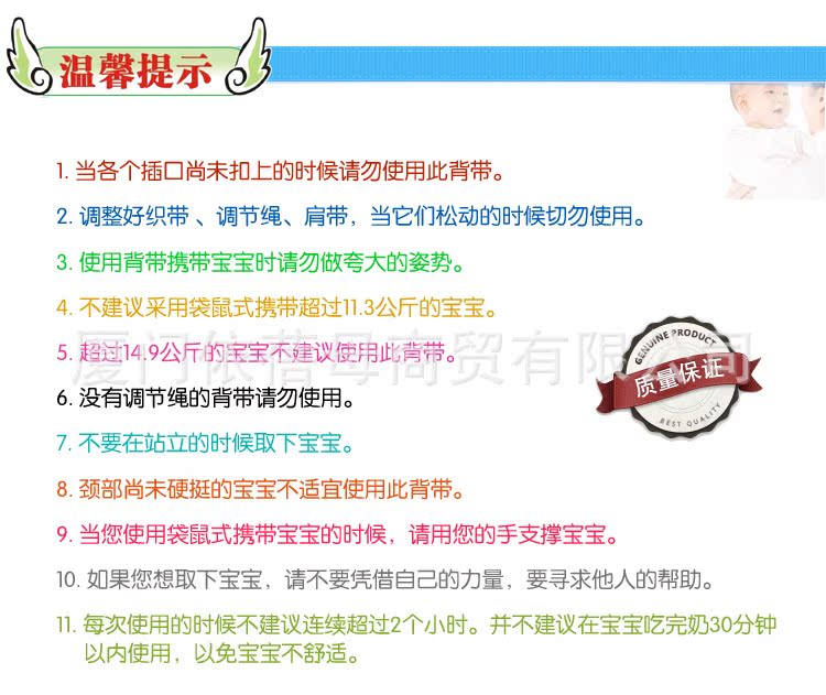 背带随身带着宝宝走动,这能开阔他的视野,使他有更多机会接触周围的人们,同时也促进其心智生理、人际交往及感情等的发展。