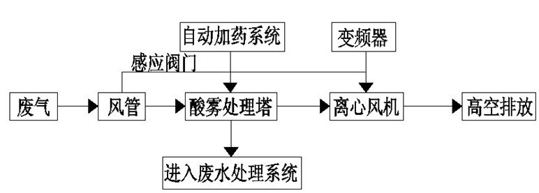 废气由风管吸入,自下而上穿过填料层;循环吸收剂由塔顶通过雾化液体分布器,形成的水雾匀地喷淋到填料层中,沿着填料层表面向下流动,进入循环水箱。由于上升气流和下降雾化吸收剂在填料中不断接触,上升气体中流质的浓度越来越低。使其酸雾得到净化,达标排放。