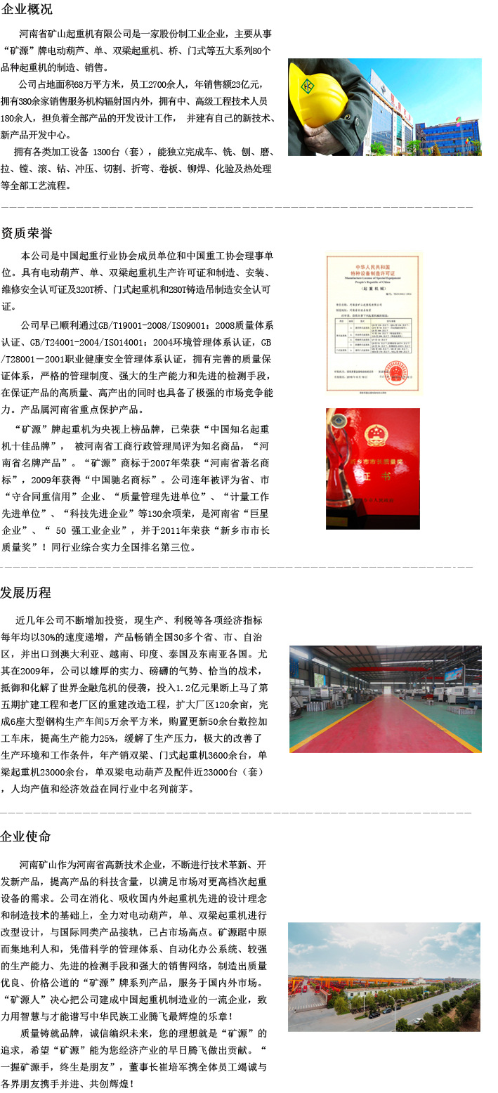 河南省矿山起重机有限公司是一家股份制工业企业,主要从事“矿源”牌电动葫芦、单、双梁起重机、桥、门式等五大系列80个品种起重机的制造、销售。本公司是中国起重行业协会成员单位和中国重工协会理事单位。具有电动葫芦、单、双梁起重机生产许可证和制造、安装、维修安全认可证及320T桥、门式起重机和280T铸造吊制造安全认可证。