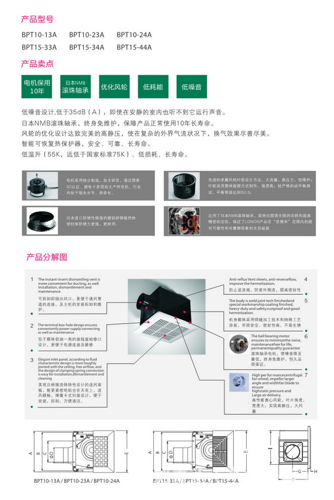 低噪音设计,低于35dB(A),即使在安静的室内也听不到它运行声音。 日本NMB滚珠轴承,终身免维护,保障产品正常使用10年长寿命。 风轮的优化设计达致完美的高静压,使在复杂的外界气流状况下,换气效果尽善尽美。