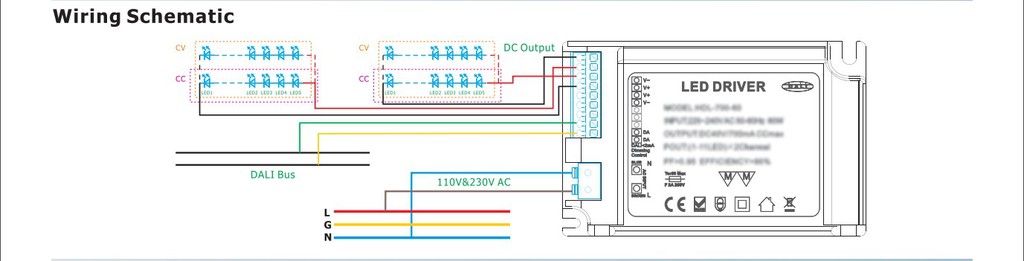 适用于DALI调光系统。输出最大功率可达60W,分为恒流输出,恒压输出,3路输出。 恒流输出一般驱动灯管,天花灯,筒灯,面板灯等,恒压输出一般驱动灯条,MR16等负载。