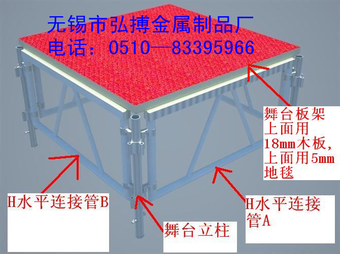 舞台板采用竹胶板,18mm厚,双层覆膜,表面防水;1.22*1.22板面框架为20*40*1.5m热镀锌方管1.22*2.44板面框架为20*40*1.5m热镀锌方管