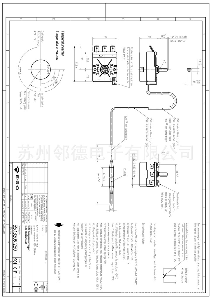 55.13209.250 温度范围 5- 43度,探头6Φ 147mm ,单极双投,常开、常闭,毛细管520mm,带160mm PVC护套