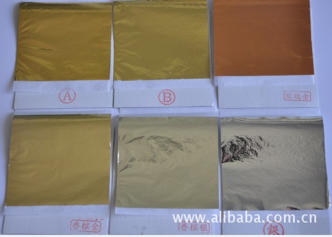 香槟金:用于替代传统工艺纯金箔,产品采用特种进口材料经高温粘合、冗压、抗氧化处理、机械切割等8道工序精心制成,具有易于粘合、抗氧化、持久不变色、不褶皱等优点,较真金箔色泽更纯更鲜亮,颜色介于B金和银之间,色质好,广泛用于酒店贴金、工程贴金、装潢贴金、工艺品、家具贴金等
