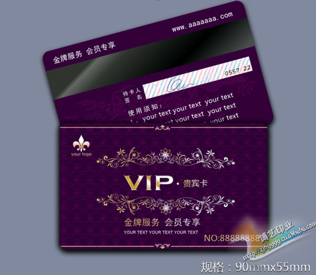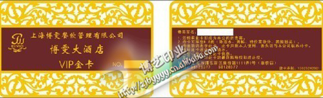 烫印金银卡是使用专用的烫金机将文字和图形烫印在PVC卡表面,形成极具金属光泽的PVC证卡,一般用来制作贵宾卡、优惠卡、VIP会员卡等。