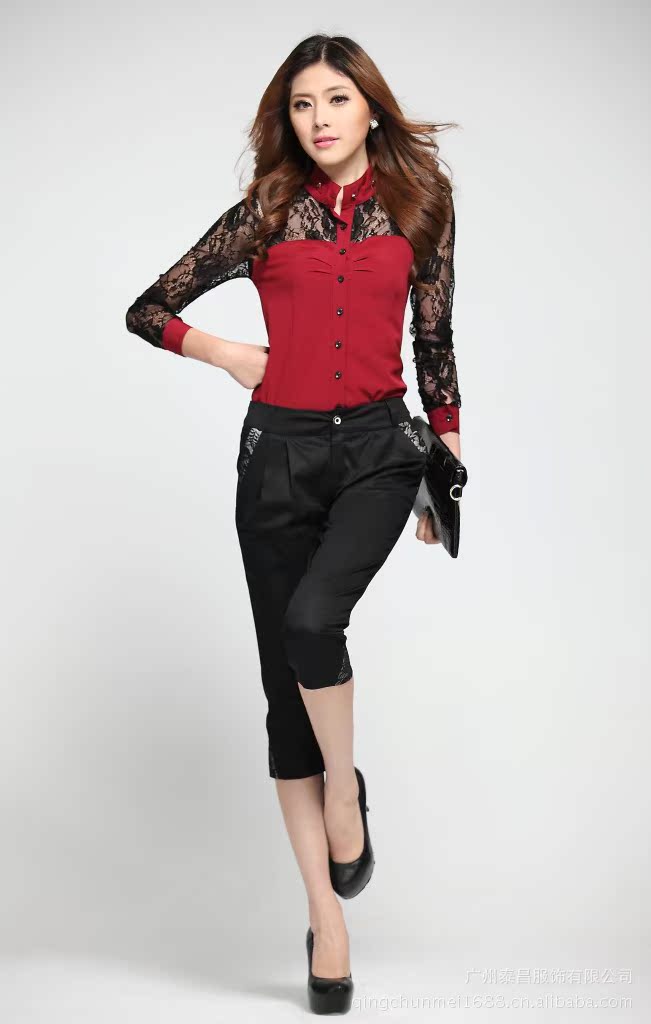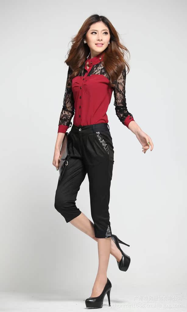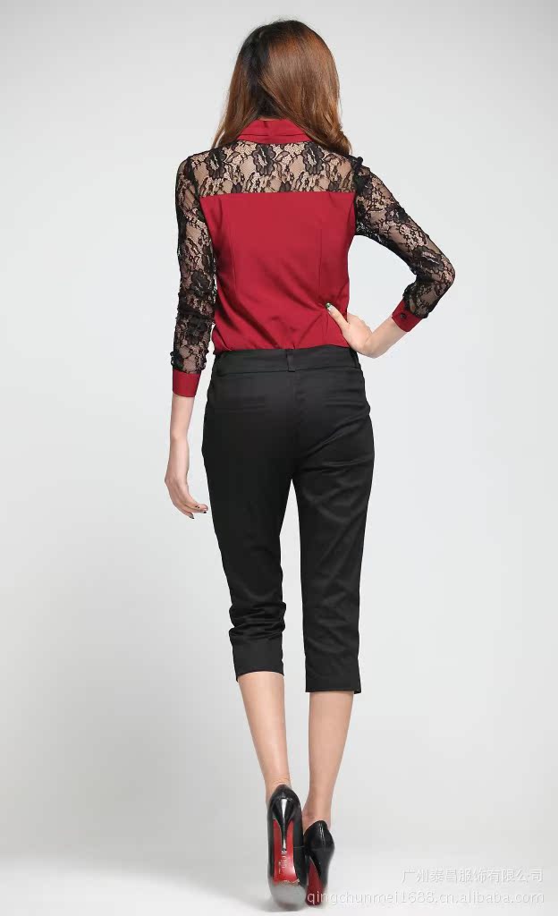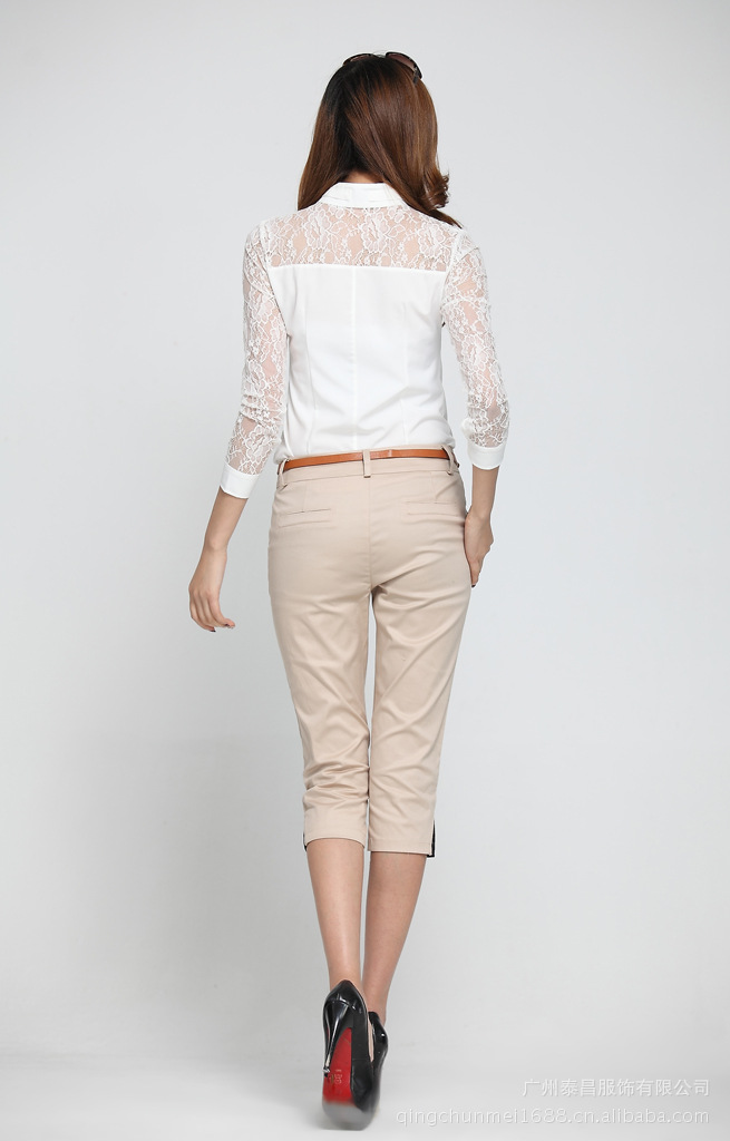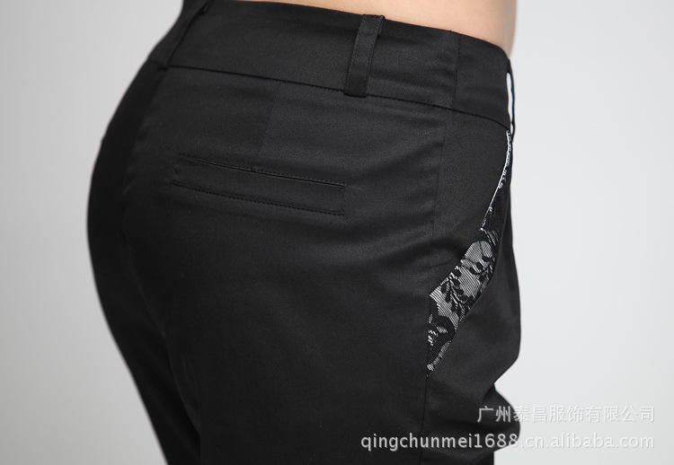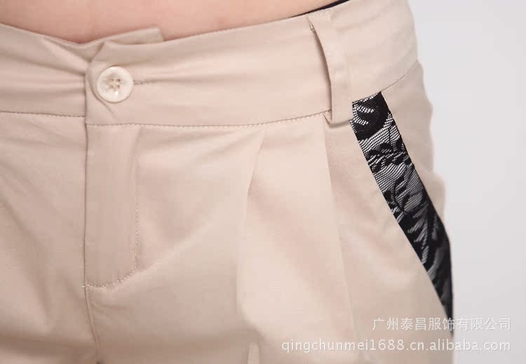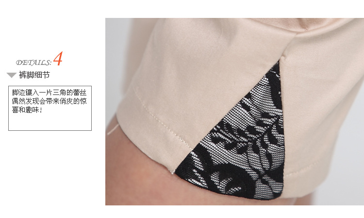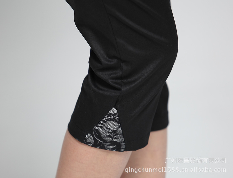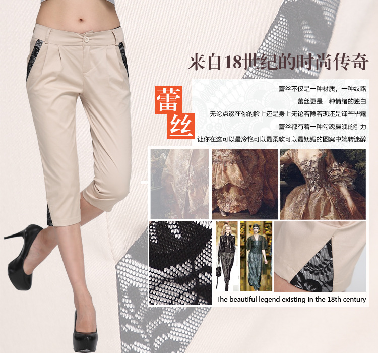 这款七分裤,亮点在于它的腰间和裤脚高档蕾丝拼接的修身版型。采用不同材质的拼接版型,显得小腿更加纤瘦,不仅较显时尚个性,且在视觉上有稍稍收紧腿部线条的效果哦!整体风格不张扬,但依然很知性哦 ! |