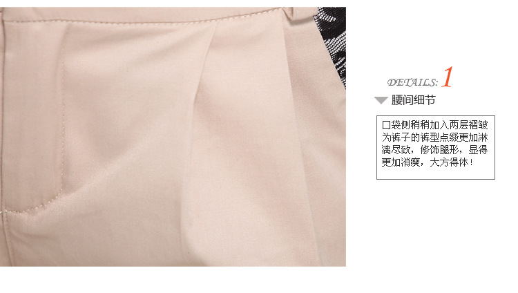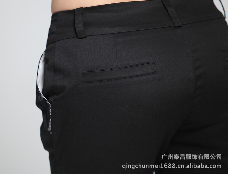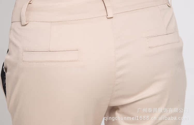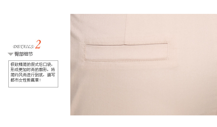 这款裤子面料色泽均匀饱和,不易起皱,不掉色,不起球,有微弹,所以为裤子加分不少哦!加上较为亲肤的特性,使它穿着起来更加自然舒适,适合不同类型和不同体型的MM哦! |