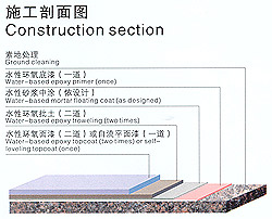 ③水性环氧中涂:将水性环氧树脂加入适量的石英砂,用镘刀将其均匀涂布数道,用于增加厚度及涂层抗压强度;
