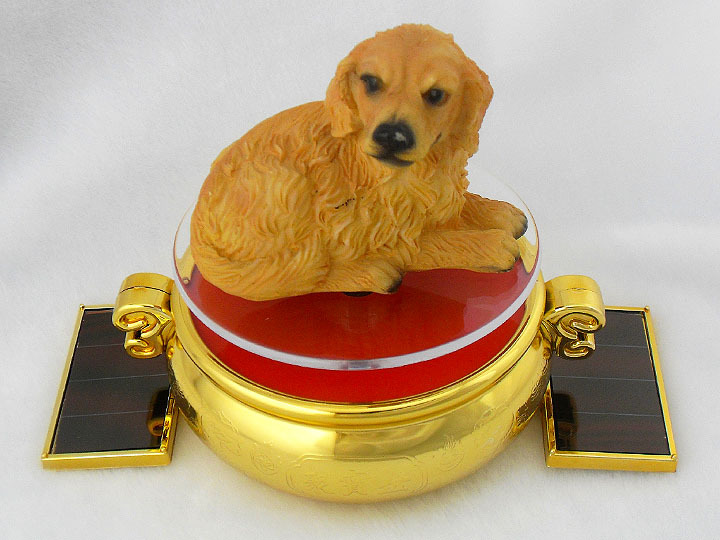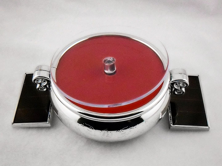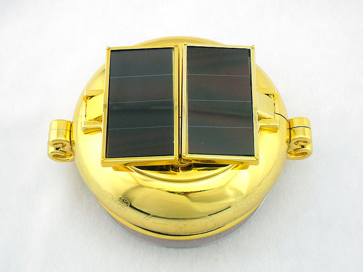 产品外表镀金,显得富贵奢华,两块伸展开的太阳能板,像是一双手,接纳这八方财源,红色的底盘,喜气温馨,象征着 和气生财,汇聚八方财源。