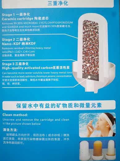 三级净化,能有效去除自来水中的细菌微生物、重金属、残余氯等有害物质,保留水中有益的矿物质和微量元素并改善口感