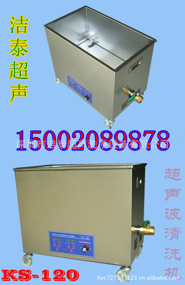 特价KS-120超声波清洗机:内槽尺寸500*300*250mm,超声波功率720W,加热功率1000W,容量37.5升。内置式发生器采用第五代式功能能调频机,高频讯线与震动子连接。质量问题一年全保.