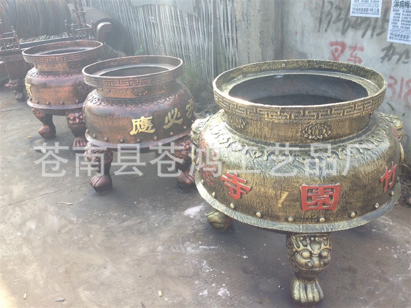 香炉:铸铁香炉、铸铜香炉、长方形平口香炉、长方形象脚香炉、长方形四龙柱香炉、长方形八龙柱香炉、长方形四龙柱两层香炉、长方形八龙柱两层香炉、圆形平口香炉、圆形六龙住柱香炉、圆形六龙柱两层香炉、仿古宝鼎香炉及梵经炉。